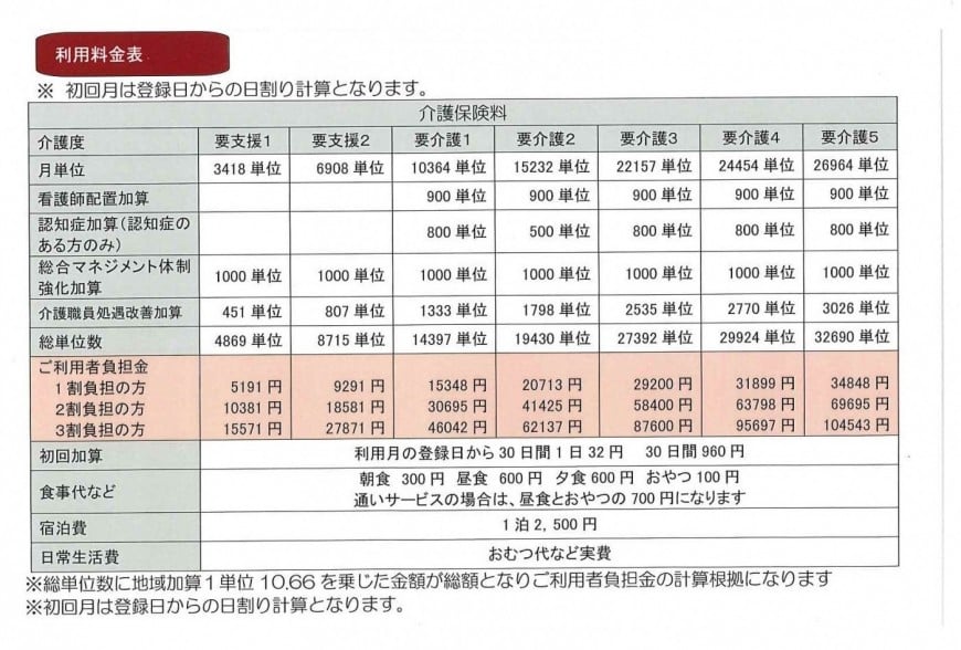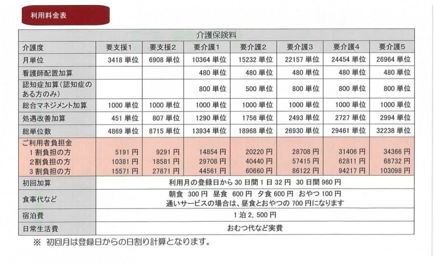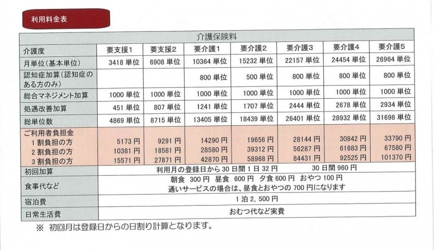 - 介護保険料の負担金は、定額制なので安心です。(個別利用サービス利用を除く。理美容代など)